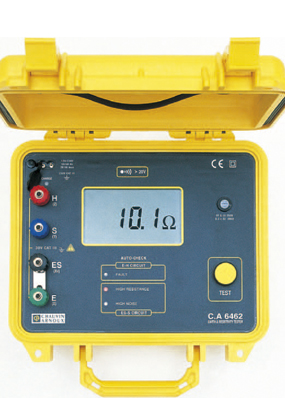 数字式接地电阻测试仪CA6462,可进行接地电阻和土壤电阻率的测量。接地电阻的测量范围为 0 至 2000 Ω,采用自动量程设计,自动切换到最佳测量量程。CA6462外壳坚固,操作简单,可进行多种测量,是电气维护人员的理想之选。其机械指标和安全指标(如:冲击测试、振动测试、跌落测试等)均符合IEC标准。由于采用高抗干扰设计,其适用于各种复杂恶劣的环境(如存在影响测量精度的高杂散电流)。CA6462采用9.6V,3500 mAh 镍氢(NiMH)可充电电池供电,内置充电电路,可接入120/230V 50/60Hz交流电,在充电过程中可持续进行测量。