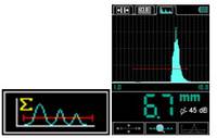 与标准 Zonotip 相比,Zonotip+ 提供了附加功能。Zonotip+ 装置附带一个额外的小型 2.5 MHz 单元件传感器,可在狭窄空间内进行测量。Zonotip+ 中的 A-Scan 模式允许排除由测试对象的缺陷或裂缝导致的测量不准确的情况。信号作为 A-Scan 显示在显示屏上,从而允许更深入地分析读数。A-Scan 模式提供以下测量选项: