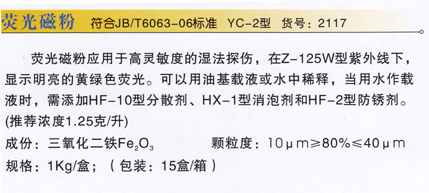 它是以磁性氧化铁粉、工业纯铁粉、羰基铁粉等为核心,再在外面粘合一层荧光染料树脂制成。在紫外光的照射下,能发出波长为510~550nm ·为人眼接受的最敏感的鲜明的黄绿色荧光,与工件表面颜色形成很高的对比度。荧光磁粉具有很高的检测灵敏度,可见度及与工件表面的对比度都远大于非荧光磁粉,容易观察察,能提高检测速度,使用范围也很广泛。