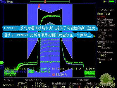 使用DRT 采样技术和Sin(x)/x 内插功能迅速调试和检定信号: TDS3000C系列融独特的数字实时(DRT)采样技术与sin(x)/x 内插功能于一身,可以在所有通道上同时精确地检定各种信号类型的特点。与其它类似示波器不同,在打开额外的通道时,TDS3000C 系列的采样率没有变化。这种采样技术可以捕获其它同类示波器可能会漏掉的高频信息,如毛刺和异常边沿,sin(x)/x 内插保证了可以精确地重建每个波形。 |