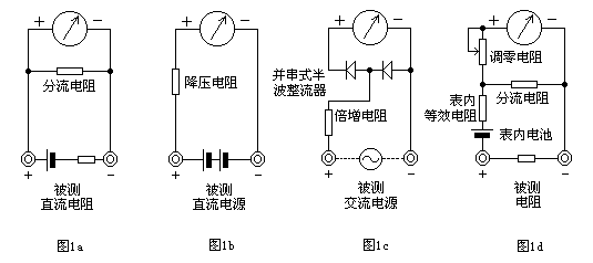 如图1c所示,因为表头是直流表,所以测量交流时,需加装一个并、串式半波整流电路,将交流进行整流变成直流后再通过表头,这样就可以根据直流电的大小来测量交流电压。扩展交流电压量程的方法与直流电压量程相似。