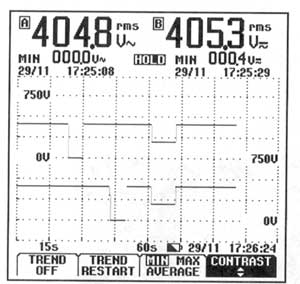 连接通道1到A相,1通道的地线到C相。你所连接的通道2到B相,其地线到C相。(注意:正如你所知道的那样,Com A和Com B在Fluke 123之中是内部连接的!)。现在选择菜单“VAC”(或者是“VAC+DC"),你将会看到来自输入的两个正弦波。确保两个通道具有相同的输入敏感度。现在选择位于通道A之中的“趋势绘图”,你将会看到几乎具有同样电压的两个图形!