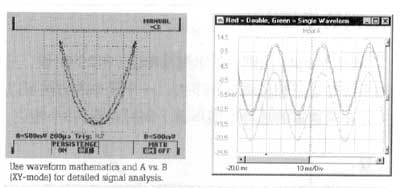 对于你的最优化的李萨育图形模式的波形显示,你最好是在记录中至少有一个但不少于3个周期的信号。利用模拟范围,时间基数不被使用,电子束通过输入A和B的x和Y直接控制。在一个数字化的示波器之中,就比如说ScopeMeter,时基的设定可以影响到李萨育图形显示。在数字的范围之中,首先波形被获得,紧接着微型处理器被使用来制造李萨育图形图像。