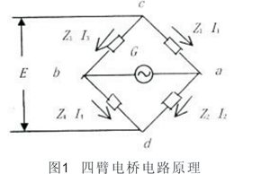 图中Z1,Z2,Z3,Z4为电桥的四臂的阻抗,E为电桥的信号源,G为电桥的平衡指示器。当电桥桥路平衡时,Uab=0,桥路平衡指示器上无电流流过,根据克希荷夫定律: